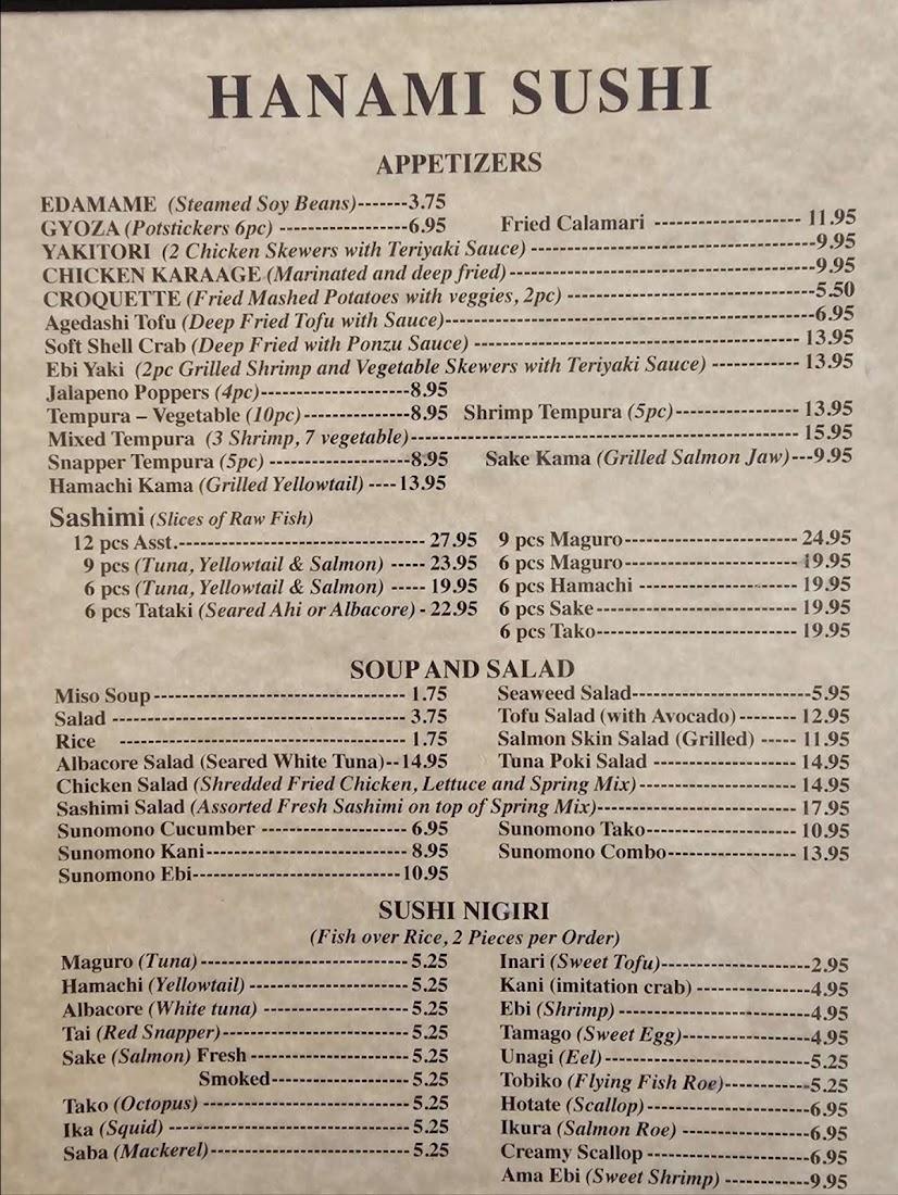 We are closed on Mondays but open Tuesday through Sunday from 11 AM to 2:30 PM and again from 4:30 PM to 9 PM. Our no-delivery policy excludes DoorDash, but you can rely on us for takeaway and dine-in. With free street and lot parking, Hanami Sushi makes enjoying Japanese cuisine easy and affordable. Join us for lunch or dinner and become part of our local sushi-loving community.